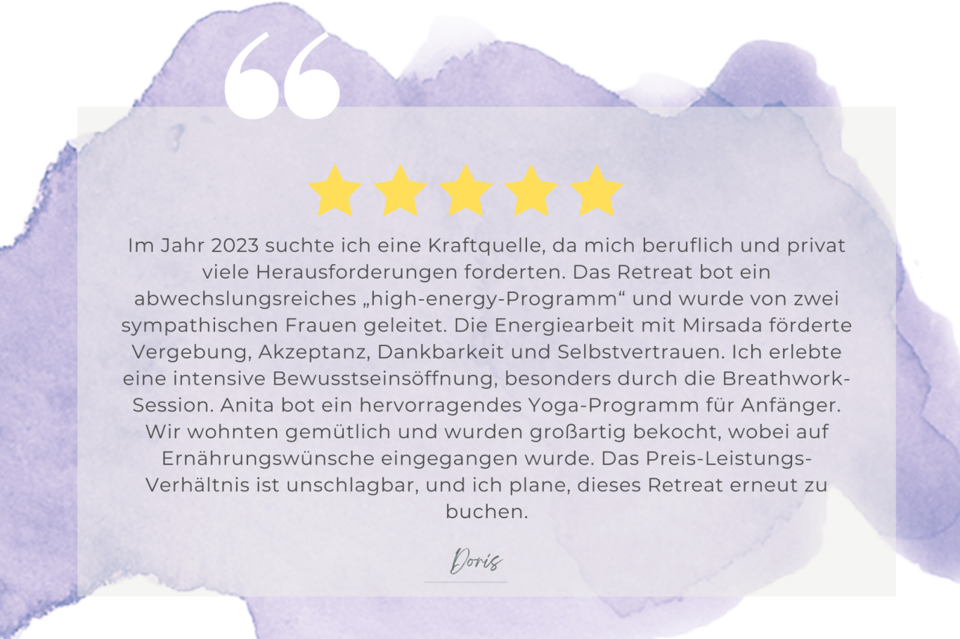 Unsere Vision: Wir haben uns zum Ziel gesetzt, unser Retreat zu einem möglichst erschwinglichen Preis anzubieten. Unser Ziel ist es, dass sich jeder diese verdiente Auszeit leisten und auch gönnen kann, unabhängig von der beruflichen Tätigkeit.
